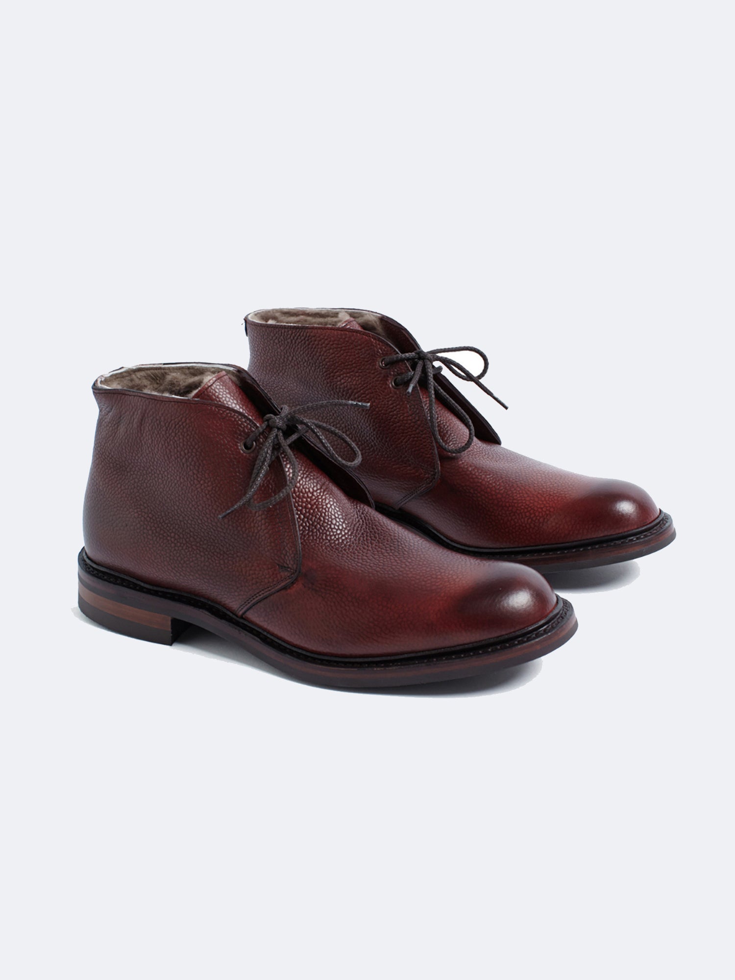 | ?Plain toe two eyelet Goodyear welted country boot with fur lining, hand finished in burgundy grain leather. Superb looking boot with substance to match the style. We have allowed for the amount of fitting the fur lining takes up in comparison to standard leather lining, so we recommend you choose your normal shoe size. |