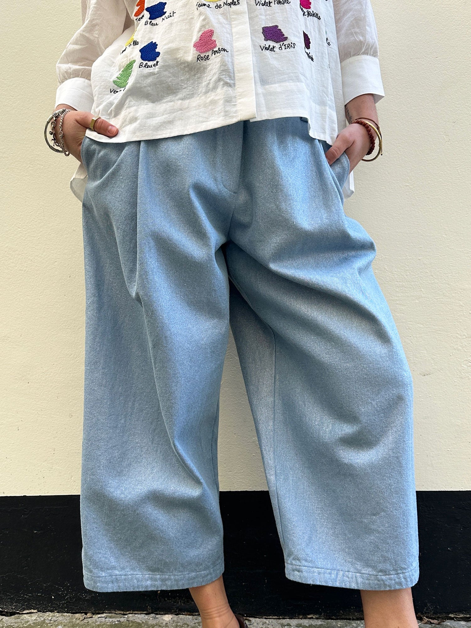 | These Les FIlles D’Ailleurs trousers are perfect for the summer. With a denim print and flowy fabic, they provide the perfect chic but casual look. They come with pleats at the top and are 3/4 in length.? |
