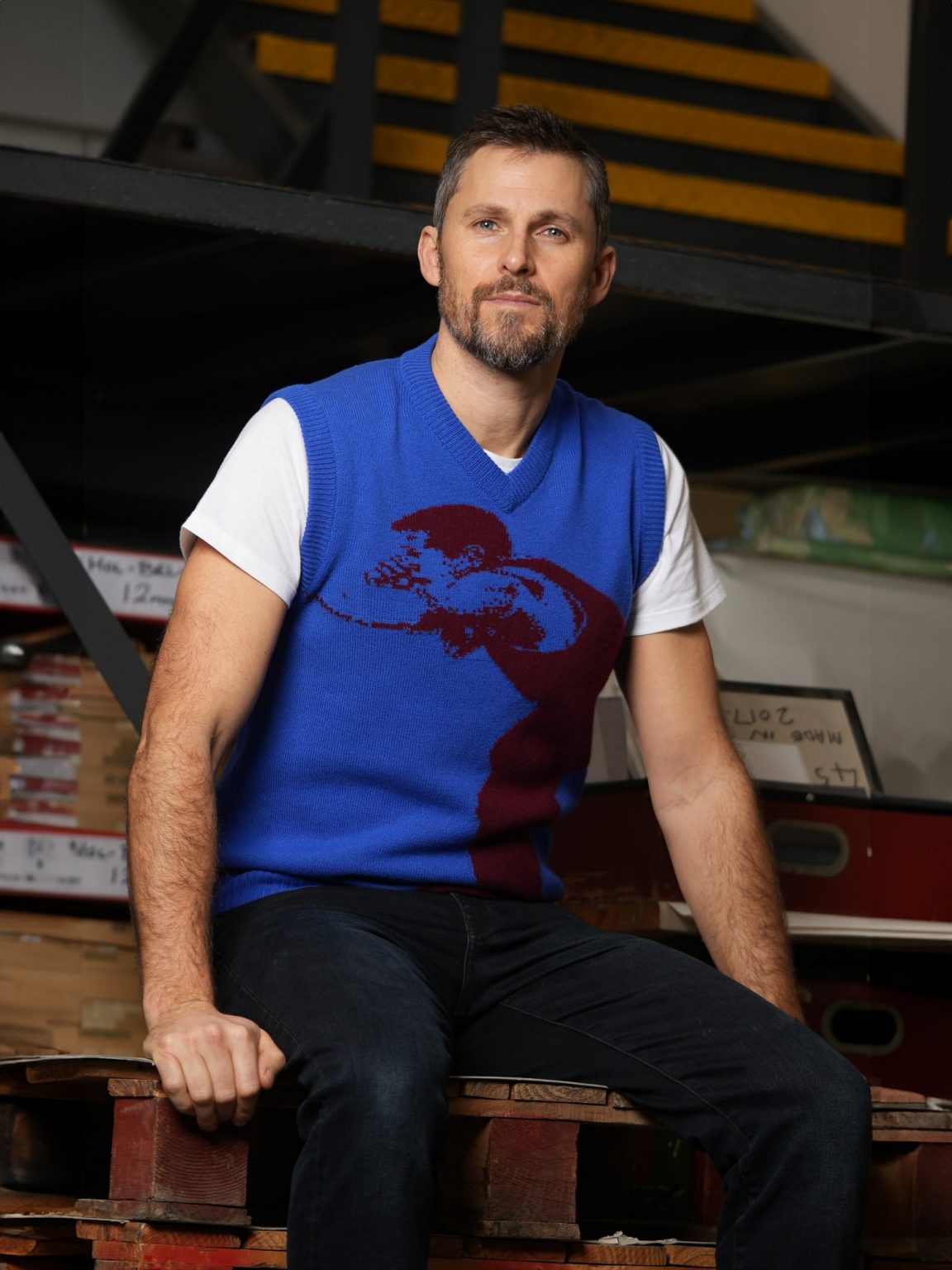 | Leathersmith of London slipover vest is made of 100% wool and it comes in cobalt blue with a boxer print. The vest features a v-neck line and fits true to size. |