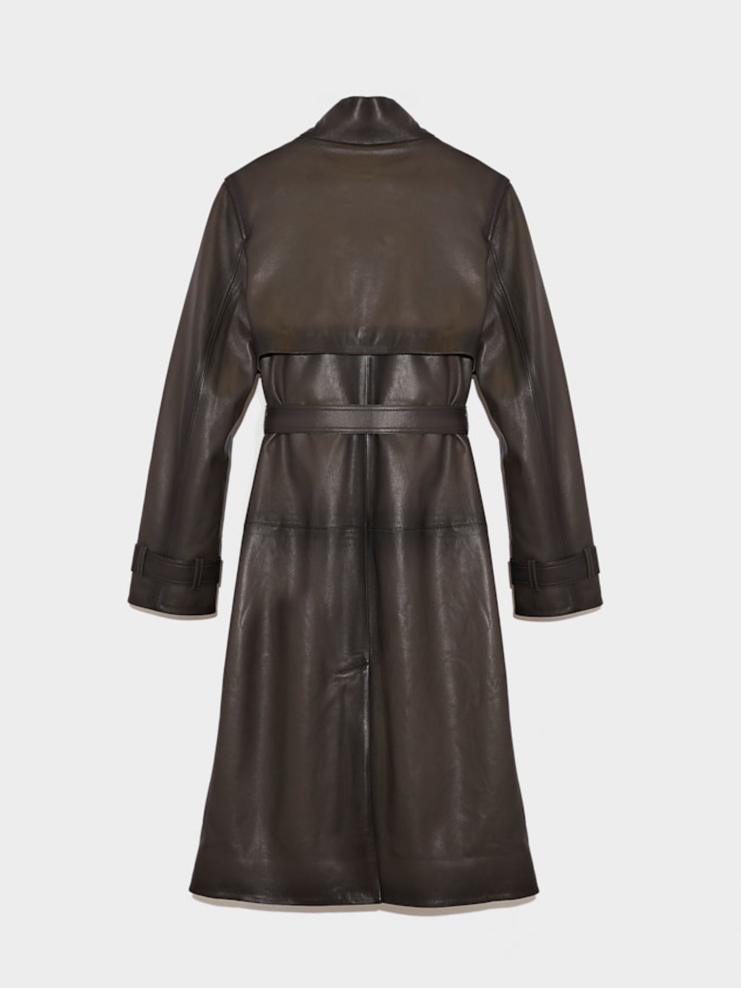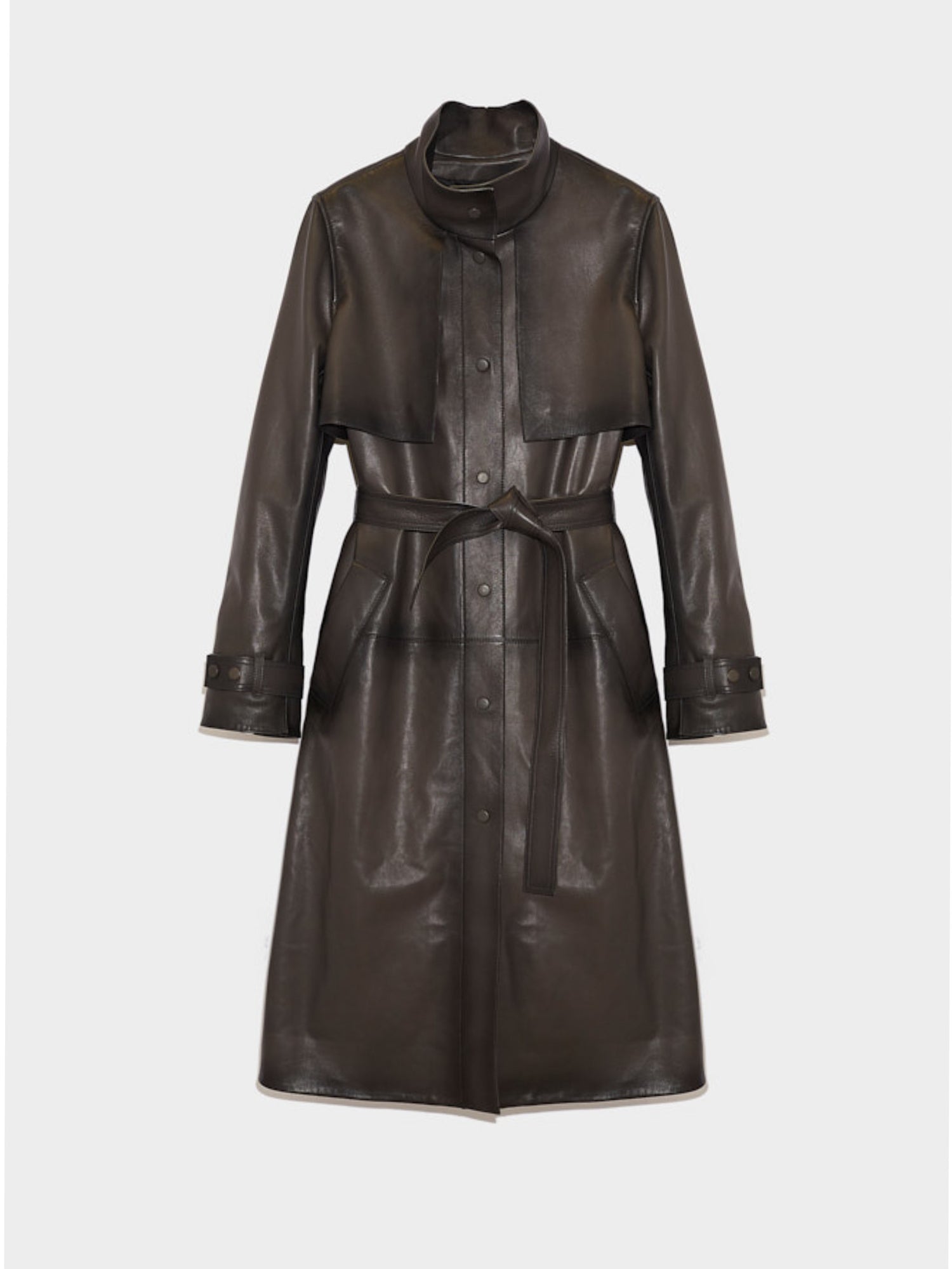 | Yves Salomon beautifully crafted long leather coat. Made from soft lambs leather, features a stand up collar, button fastening, belt on the waist and on the cuffs and side pockets. Classic piece, perfect for transeasonal weather – piece you will keep forever!? |