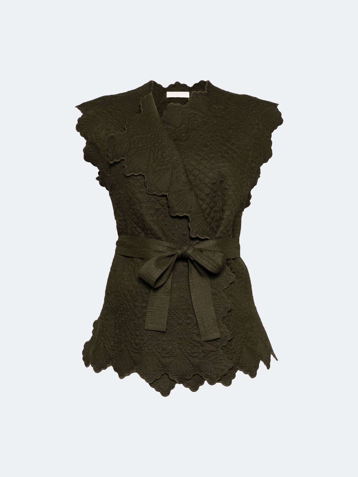| Ulla Johnson Leiro Vest is embroidered with diamond shape motifs inspired by Victorian quilting. This sleeveless style is made from military green cotton voile, it is lightly padded and trimmed with geometric scalloping. It is a versatile piece and can be worn fully closed and cinched with the removable belt, or layered and worn open for a more casual day look. |