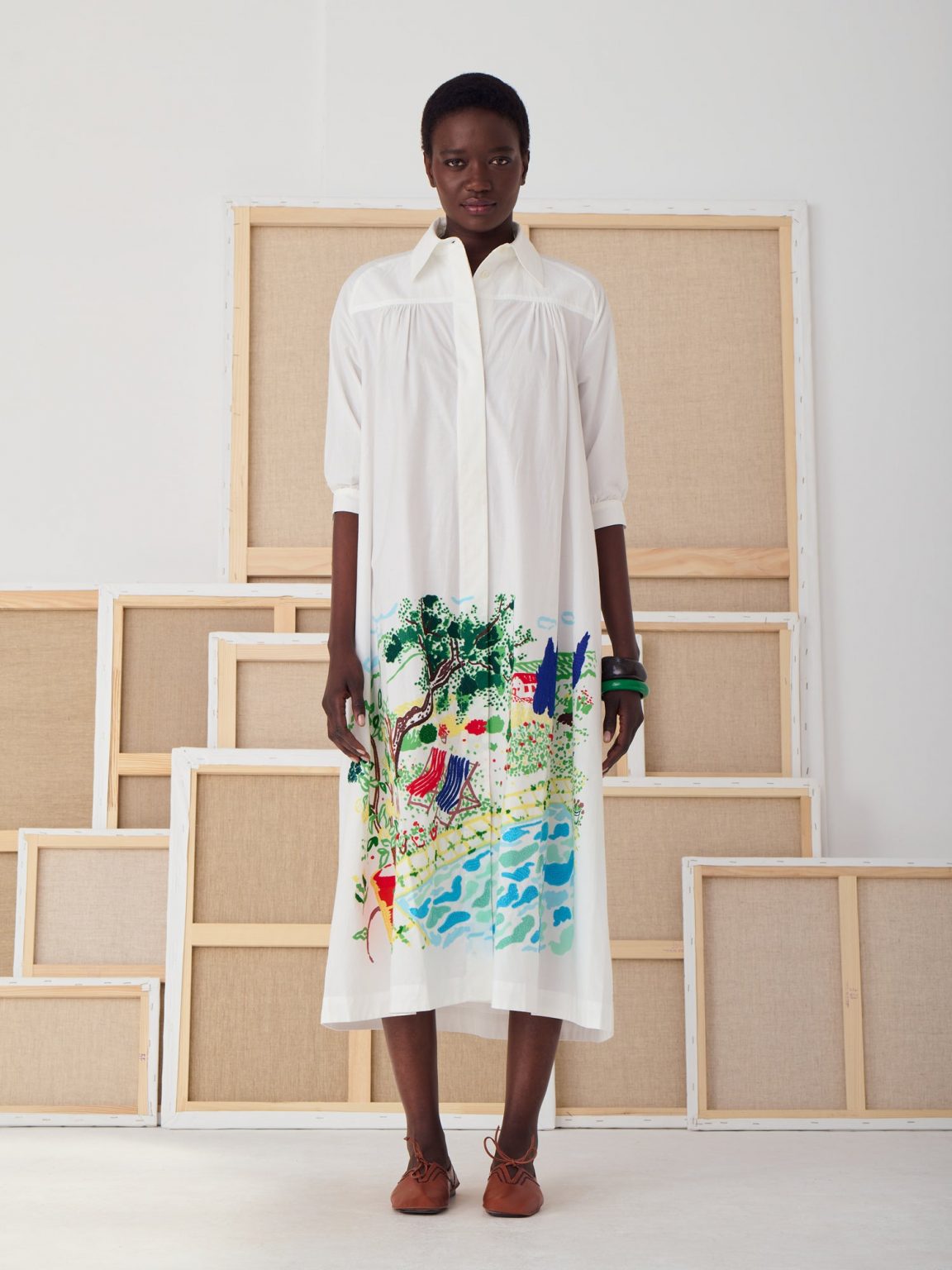 | Mii Collection Niki is a loose fitting, a-lined long shirt dress. It features hidden placket with button closure, collar, yoke with pleat detail and elbow length sleeves. This season it comes with a playful, painterly print of pool in the garden. |