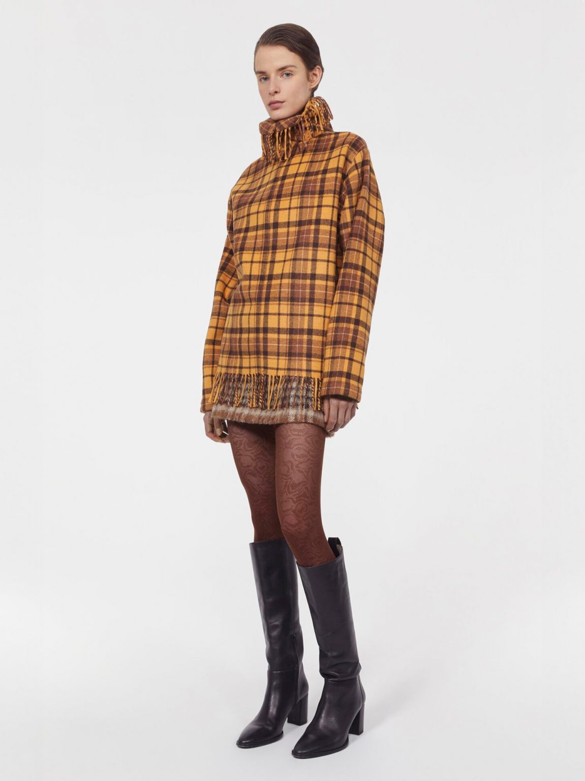 Rodebjer Savage pull over is made from a blend of wool with a ?70s check finish, it has dropped shoulders and a high neckline that is trimmed with fringing. Pair with a brushed check skirt to tap into the eclectic mood of the season. Model wears M. |