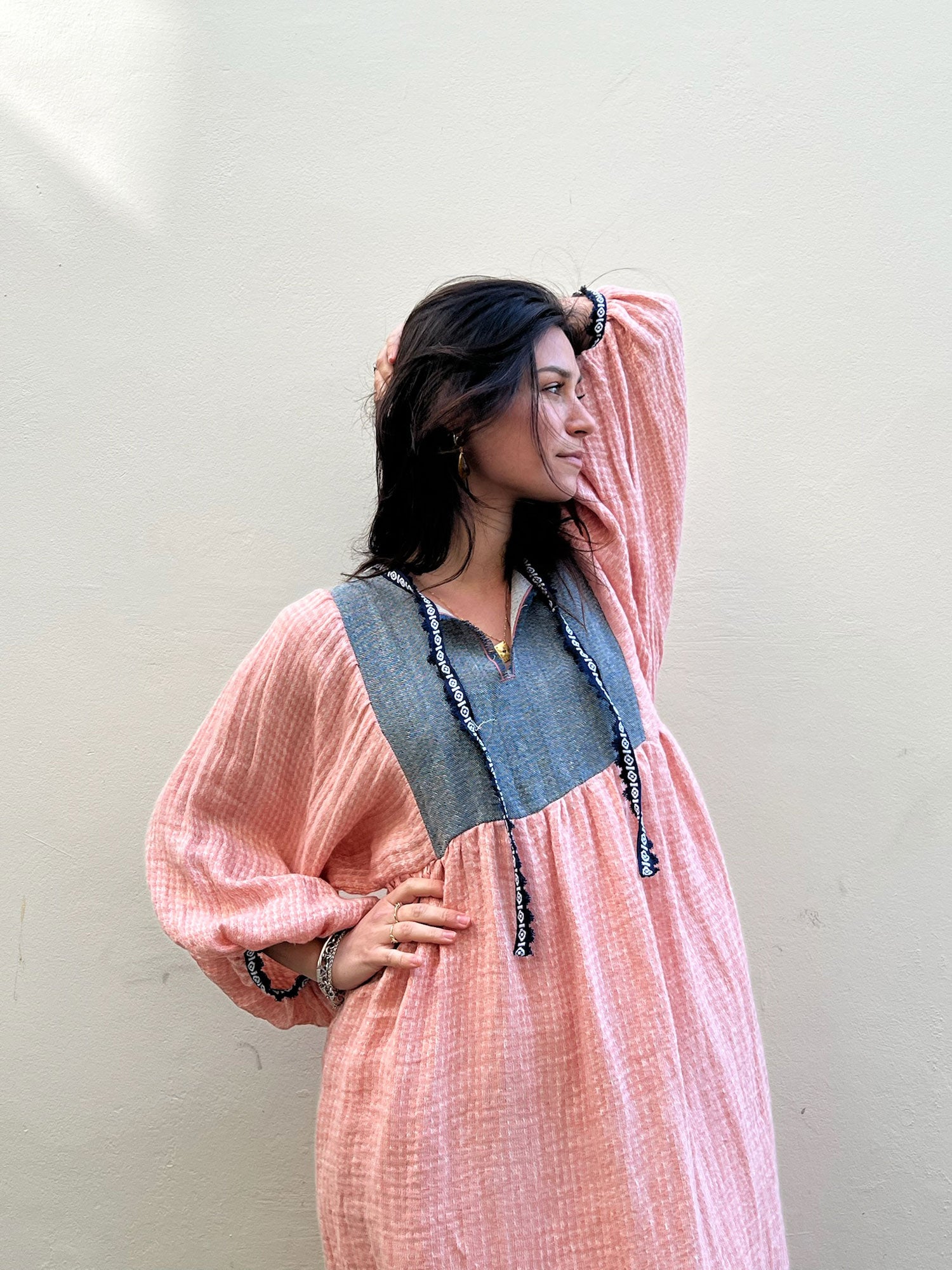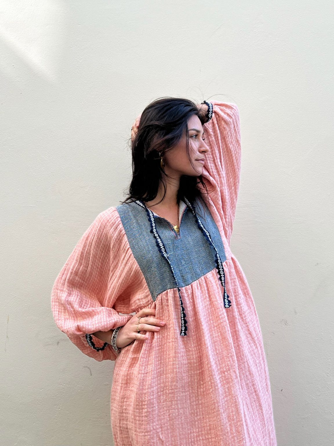 This Nina Leuca Zefiro Maxi Dress is soft, airy and effortlessly elegant. The textured rose-colored linen drapes beautifully, while the contrasting denim-hued loom-woven top adds a touch of rustic charm. Intricate navy blue embroidered trims and delicate tie details bring a refined bohemian aesthetic, while the billowy sleeves enhance the dress?s relaxed, free-spirited feel. |